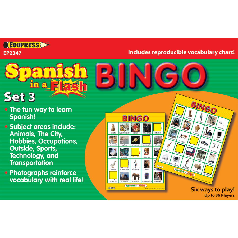 Spanish in a Flash es un sistema de aprendizaje que facilita a los estudiantes trabajar a su propio ritmo mientras dominan conjuntos de palabras. Los juegos de bingo tienen imágenes fotográficas. Las palabras corresponden al español en una tarjeta de memoria. Incluye un cuadro de vocabulario reproducible, 36 cartas de juego, 100 tarjetas de llamadas y 500 marcadores de bingo. Apoya los requisitos del Título I y otros programas financiados por el gobierno federal.