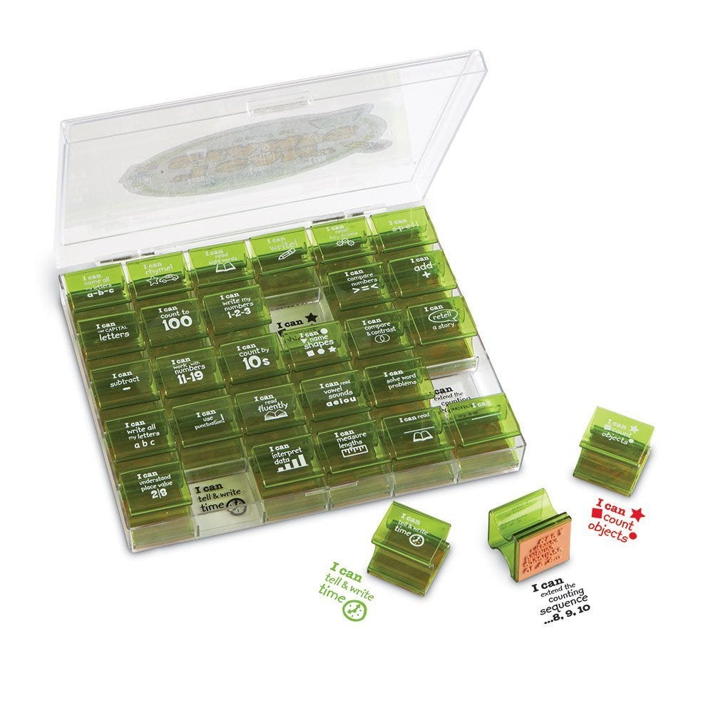 ¡Ponga su sello de aprobación en los logros de los estudiantes! Los sellos gigantes ilustrados presentan declaraciones alentadoras que se corresponden con los Estándares Estatales Básicos Comunes de ELA y Matemáticas para Kindergarten y 1er Grado. Incluye 30 sellos.