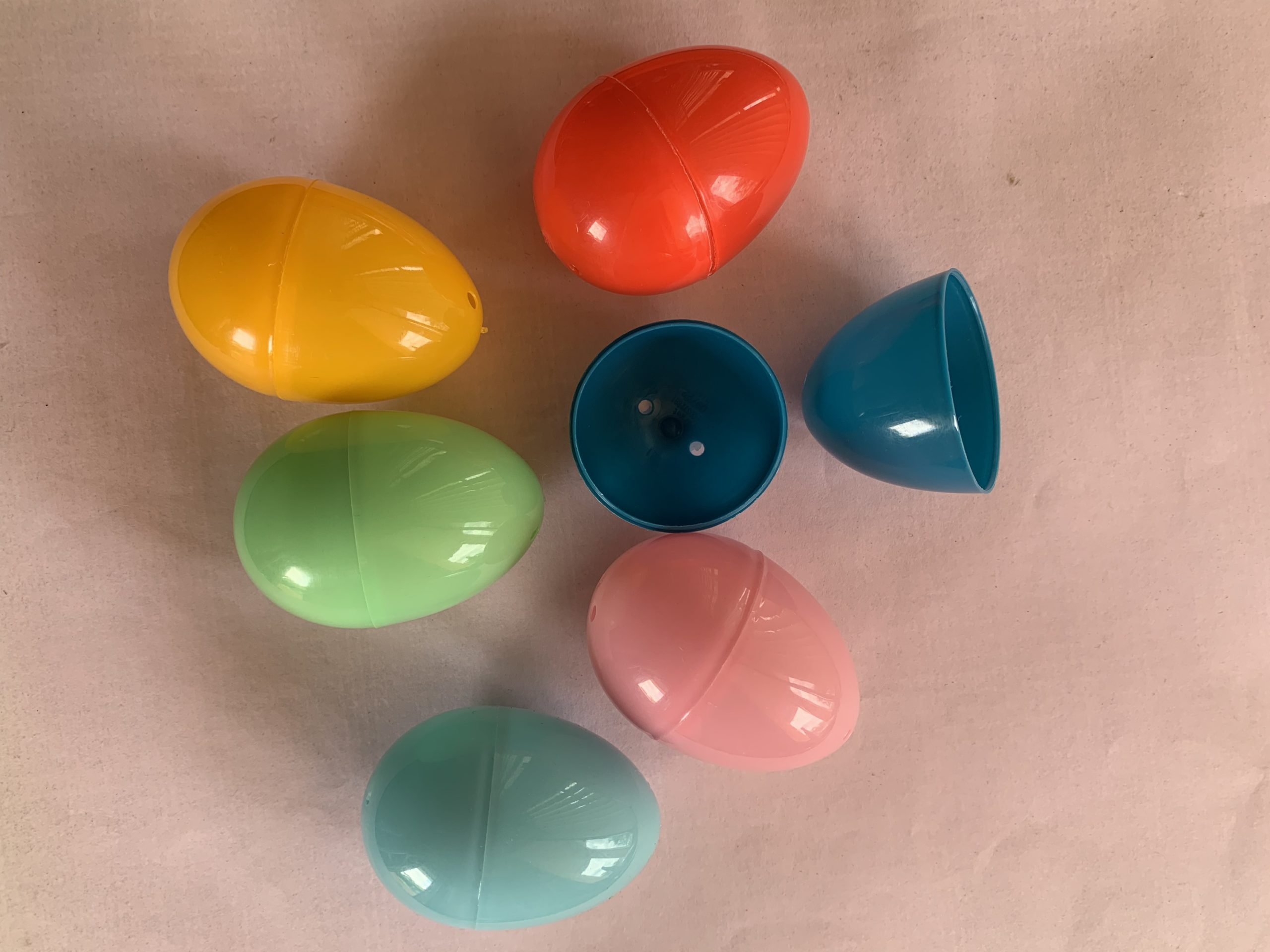 Estos huevos de plástico vienen en 6 colores (amarilo, celeste, verde, anaranjado, fuscia y morado) y sirven para colocar obsequios, como decoración y como un juguete para los niños. Desarrolla motora fina, estimula la observación y puede utilizarse para trabajar secuencias, conteo, clasificación por colores, memoria, entre otras actividades.