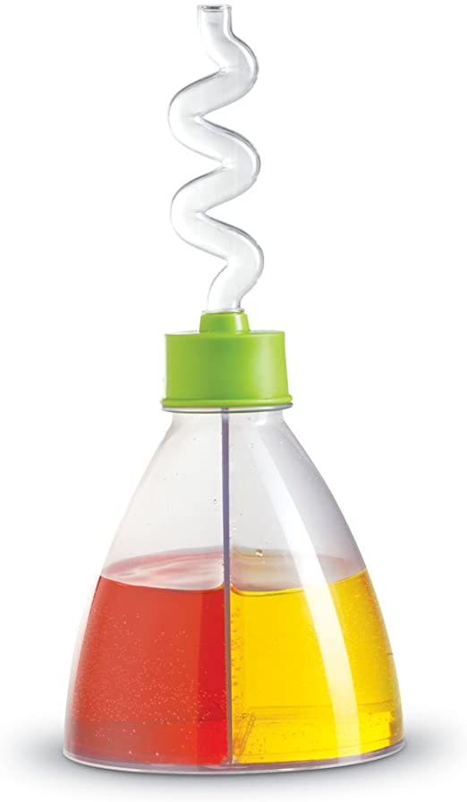 El matraz dividido permite dos cámaras de líquido coloreado, y una pajilla en espiral proporciona una ruta de salida para el nuevo color mixto. El matraz (sin pajilla) mide 14.6 cm alto x 11.43 cm de diámetro.