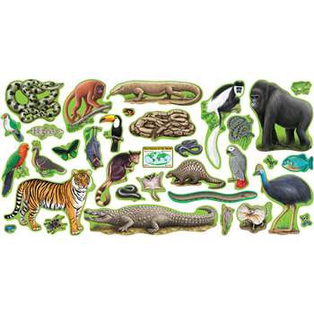Presente a los estudiantes las muchas criaturas que habitan en la selva tropical. Las obras de arte vívidas ofrecen representaciones realistas de animales para excitar las mentes jóvenes. Incluye una Guía de descubrimiento llena de datos para mejorar las lecciones de ciencia y geografía. 37 piezas, hasta 25 1/2" de ancho.