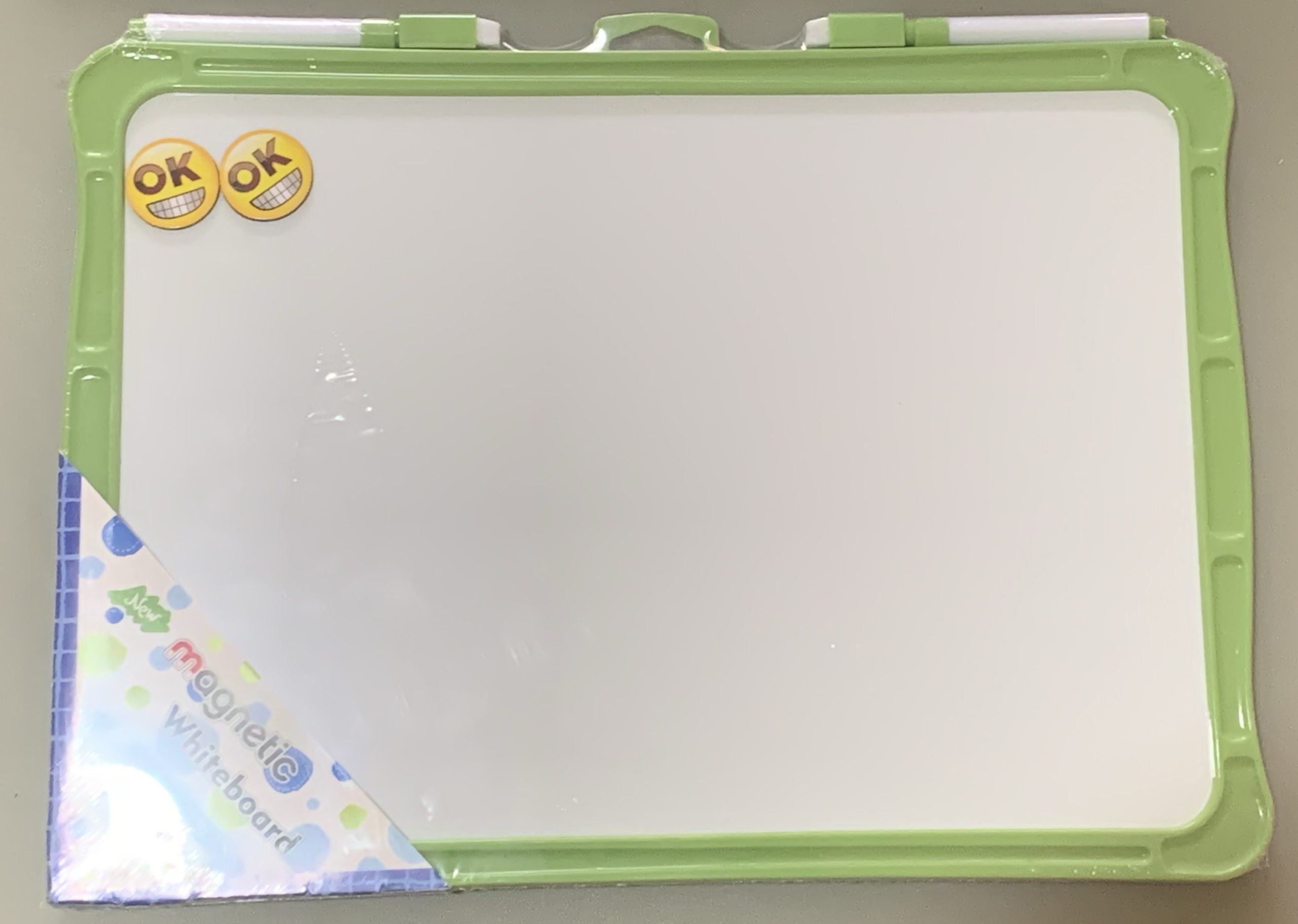 Pizarra de base metálica cubierta de cartón con revestimiento acrílico por ambos lados y marcó Plastico. Incluye 2 marcadores acrílicos y Magneticos con borrador de pizarra y 2 fichas magnéticas de emoji.